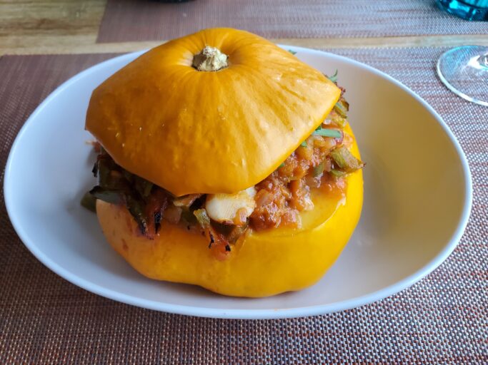 Voor dit recept kun je elk type pompoen gebruiken, want na het garen, hol je de schil uit.